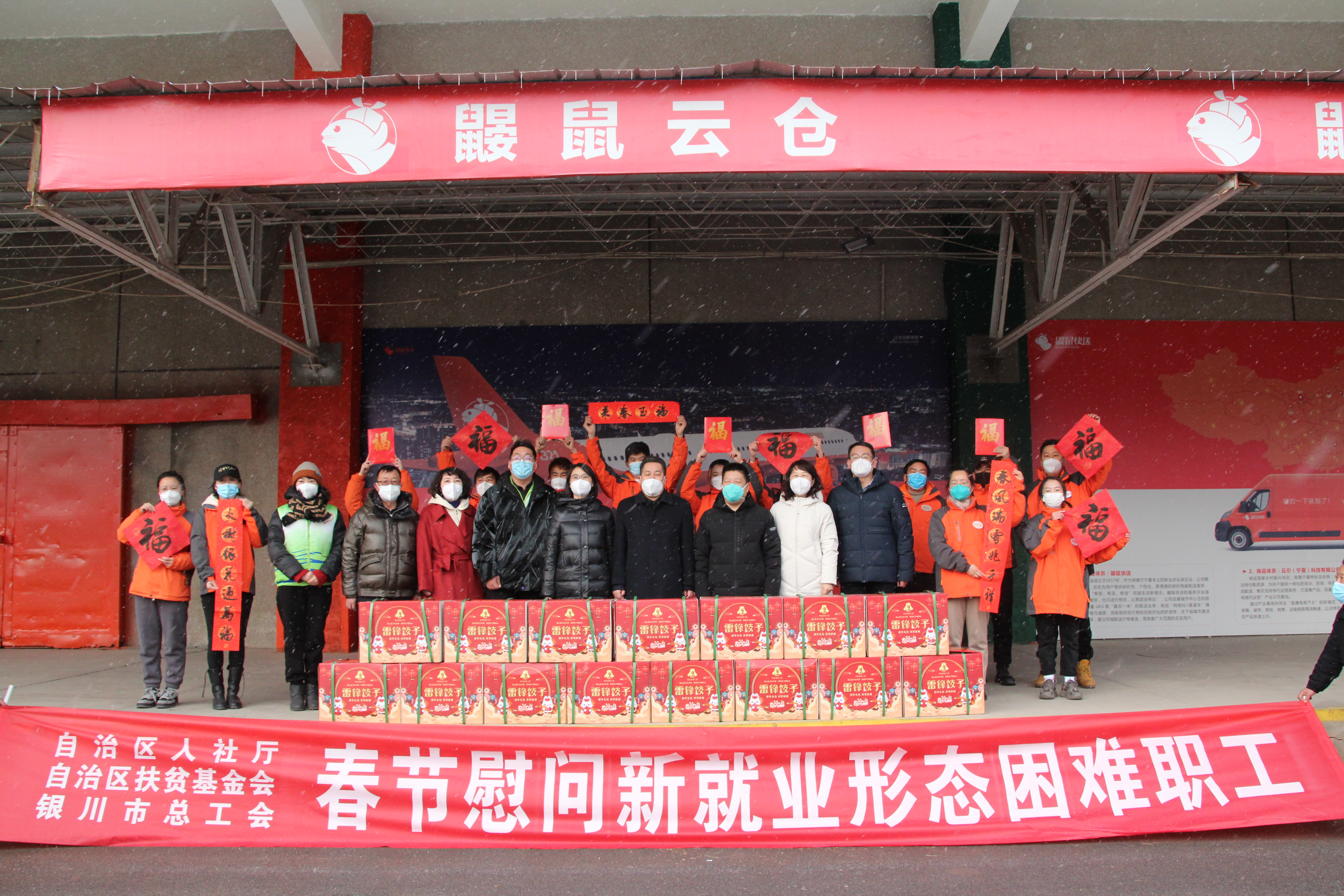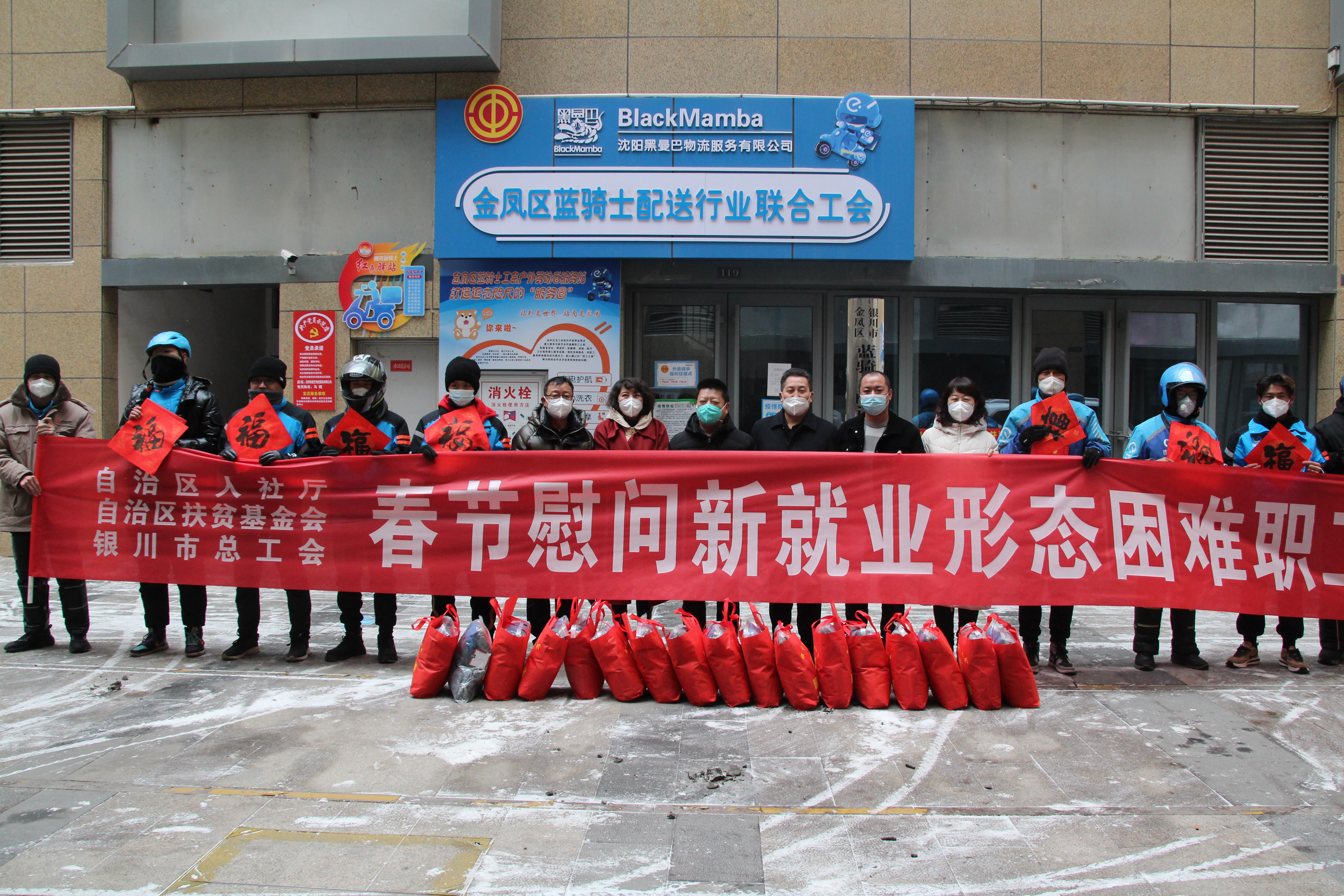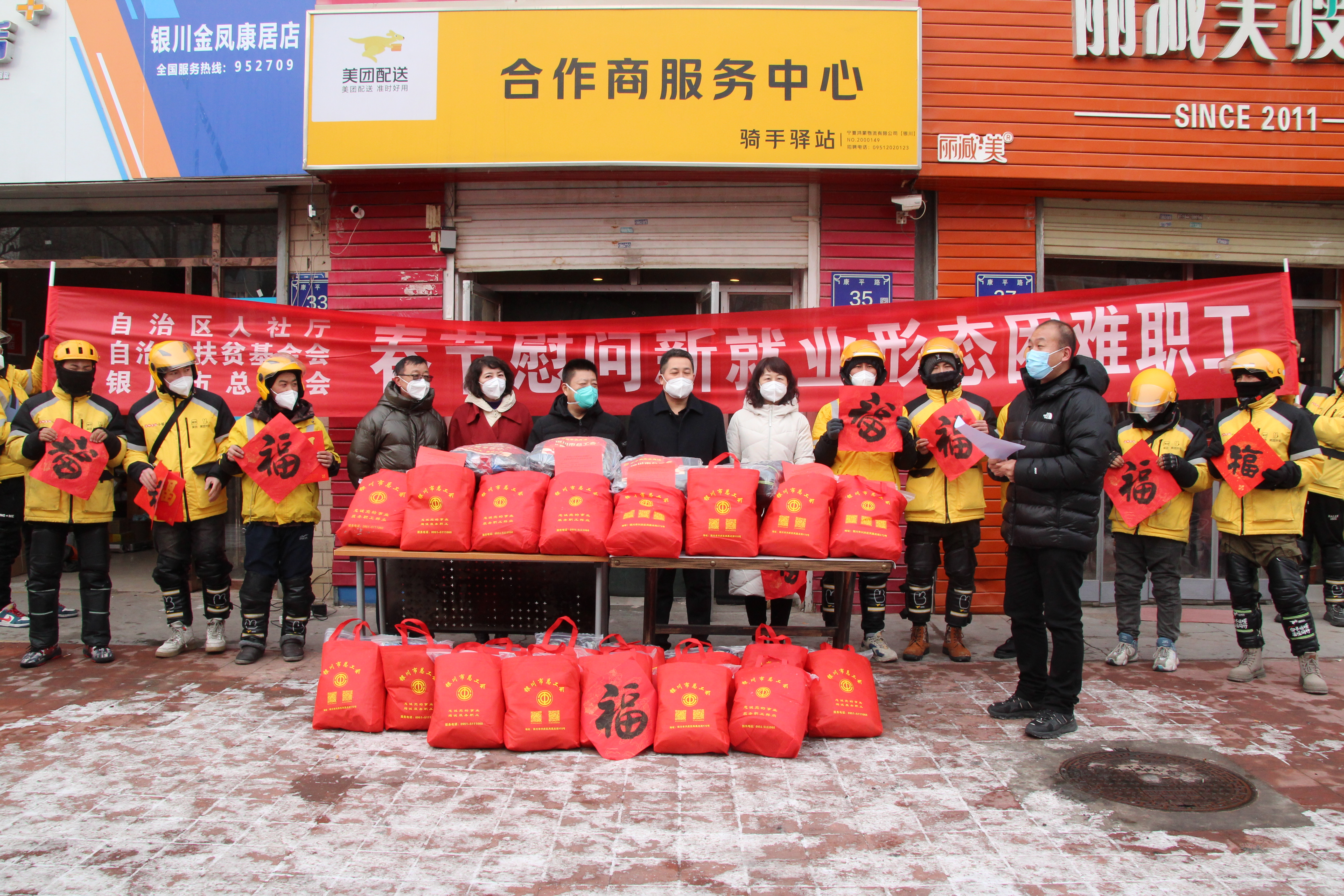 在2023年春节前夕,自治区“两会”召开之际,自治区人社厅联合自治区扶贫基金会、银川市总工会,共同慰问了我区新就业形态困难职工,在冬日的严寒与茫茫大雪中带去自治区党委、政府的亲切关怀与人社等部门的真心关爱。
