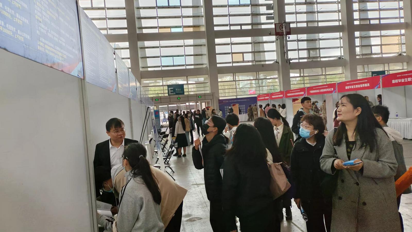 宁夏环欧新能源技术有限公司招聘台前,挤满了前来求职的大学生。刘丽认真浏览该企业悬挂的招聘信息,并向企业人资专员递上一份个人求职简历。“我在浙江财经大学读完大学本科后,考上了宁夏大学材料与化工专业研究生,今年即将毕业,希望能找一份适合自己专业的工作。”这次招聘会刘丽有备而来,她精心准备了10余份个人求职简历,并向几家她认为有发展空间的企业逐个投递了简历。