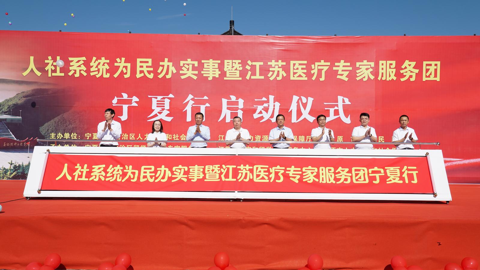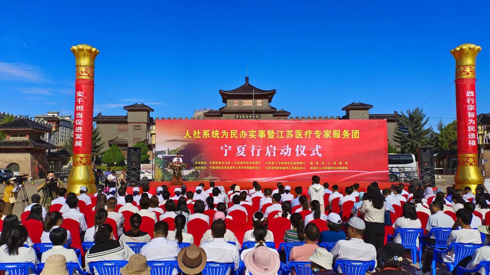 8月14日,自治区人力资源和社会保障厅会同江苏省人力资源社会保障厅组织开展的“人社系统为民办实事暨江苏医疗专家服务团宁夏行活动”启动仪式在固原市举行,江苏省医疗服务专家团、苏宁两地人社部门主要负责同志、固原市人民政府和服务单位负责人及当地群众等200余人参加。