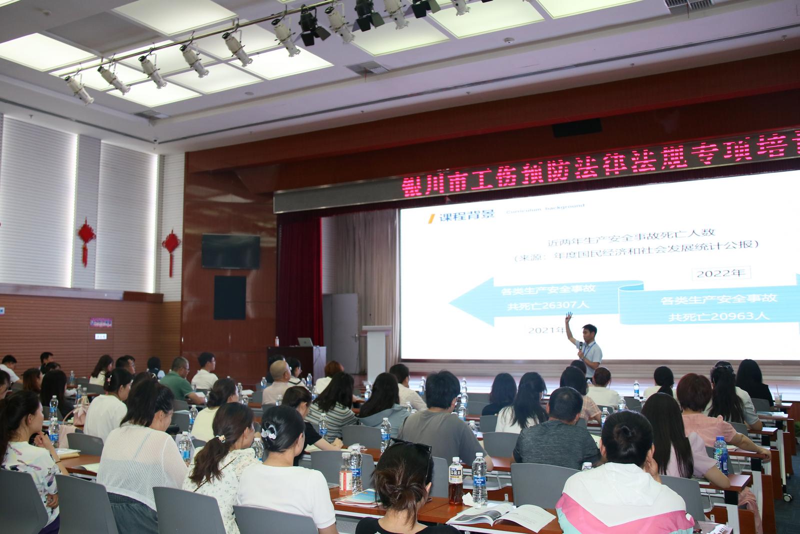 7月25日,银川市人力资源和社会保障局、银川市社会保险事业管理中心联合举办工伤预防法律法规专项培训班,组织辖区150家重点企业的安全管理人员和社保经办人员共104人参加培训。
