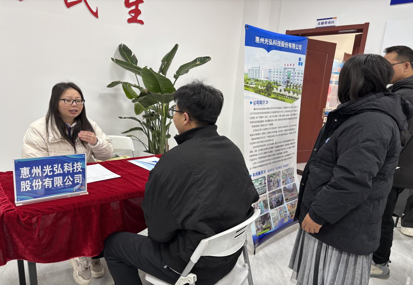 招聘会现场,3家企业的招聘展位前咨询者络绎不绝。招聘专员通过发放宣传手册、播放企业宣传片、现场答疑等方式,详细介绍岗位要求、薪资待遇和晋升通道。惠州光弘科技股份有限公司招聘专员介绍,此次带来115个基础岗位,月薪5000-12000元,配套五险一金、年终奖和员工宿舍等福利,“就是希望吸引更多踏实肯干的人才加入”。