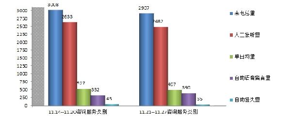 11月21日--27日咨询量较11月14日--20日咨询服务量略微有下降:来电总量较上周下降101个,环比下降3.36%;人工接听量较上周下降151个,环比下降5.73%;自助语音留言量较上周增长58个,环比增长17.47%;社保卡自助挂失量较上周下降8个,环比下降18.6%。