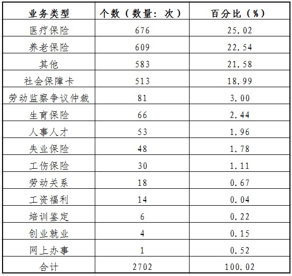 11月21--27日,12333咨询服务中心人工接听总量2482个,解答百姓问题2702个。本周咨询服务排名前5位的问题是医疗保险、养老保险、社会保障卡、劳动监察争议仲裁以及其他类问题。主要是查询养老保险信息、查询医疗保险余额、咨询医保缴费及报销问题、询问社会保障卡制卡进度以及农民工欠薪投诉举报等。